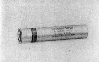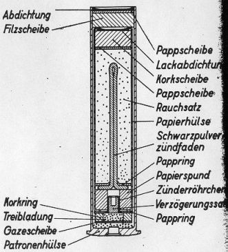 4. Beim Schuß wird die Treibladung durch das Zündhütchen entzündet, der Rauchkörper herausgeschleudert und gleichzeitig sein Verzögerungssatz entzündet. Etwa 15–20 m von der Pistole entfernt (Flugzeit etwa 0,5 sec.) zerknallt der Rauchsatz unter Entwicklung einer weißen Rauchwolke. Hierbei wird die Papierhülse zerrissen; die Reste des Rauchkör-pers fallen gefahrlos zu Boden. |