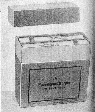 5. 10 Patronen befinden sich in einer Pappschachtel, die mit braunem Papier mit aufge-druckter Inhaltsbezeichnung umklebt und zum Schutze gegen Feuchtigkeit paraffiniert ist (Bild 3). |