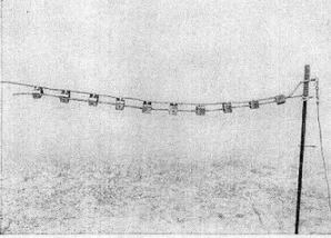 Einer der Eisenpfähle muß mit einem Lager zum Einlegen des Zündschnuranzünders ver-sehen sein. Der Pfahl ist so zu stellen, daß der eingelegte Zündschnuranzünder in der Ab-zugsrichtung liegt. Die Zielfeuer hakt man mit ihren Blechhaken in den ausgespannten Draht ein (Bild 2). |