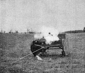 19a. Um den Angriff bewegbarer Ziele der Wirklichkeit anzugleichen, z.B. bei Kampfwa-genangriffen, werden diese, wie nachstehend beschrieben, mit Zielfeuern ausgerüstet. Das Mündungsfeuer eines fahrenden Kampfwagens kann z.B. dadurch dargestellt werden, daß an einem vor der Attrappe angebrachten Draht eine Geschützzielfeuerreihe n.A. mit Feuererscheinung befestigt wird. |