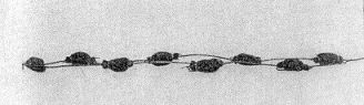 41. Es sind 120 mm breite Beutel aus Haarkörperschlauch, die mit Nz.Man. N.P. (1,5 x 1,5) und Ocker gefüllt und auf Zeitzündschnur 30 gereiht sind. An einem Zündschnurende befindet sich der Zündschnuranzünder 29 (Bild 12).