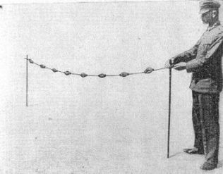 Stauberscheinung (für Beobachtungs- und Anschneideübungen). Reihe ausgelegt, Abziehen von Hand, der erste Schlag ist etwa 40 cm vom Zündschnuranzünder entfernt. |