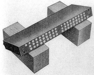 76. Die Gewehrzielfeuervorrichtung besteht aus der Kopfplatte, dem Ladestück und der Bodenplatte. Die hat 56 Schußlöcher, die durch eine in Rillen eingelagerte Zündschnur verbunden sind. Jeder Schuß ist mit Zündschnurpulver und Nz.Man. N.P. (1,5 x 1,5) ge-laden und durch einen Holzpfropf verschlossen (Bild 26). Das Anzünden der Zeitzünd-schnur erfolgt durch eine Feldschlagröhre, die in eine der beiden Bohrungen des Lade-stücks einzulegen ist. |