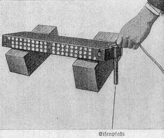 Vor dem Hinlegen läßt man die Vorrichtungen mehrmals kräftig mit dem Boden auf die Un-terlegklötze, damit sich das Zündschnurpulver nach unten lagert. |