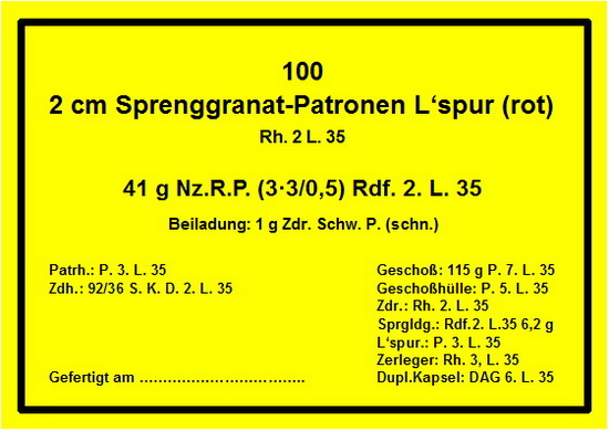 | Zusammenstellung der Inhaltszettel für Munition der Handfeuerwaffen und M.G. und Munitionsteile einschließlich der 2 cm Munition |