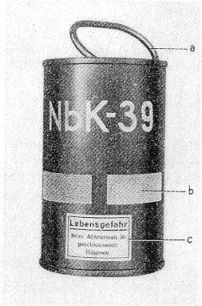 3. Zur Kennzeichnung als Nebelmittel trägt die Nebelkerze einen weißen Streifen (f) rund um den Mantel und die Bezeichnung Nb K 39 in weißen Buchstaben. |
