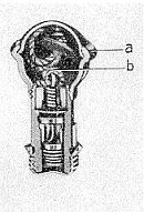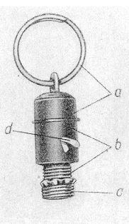 Der Zündschnuranzünder 39 (Bild 5 und 6) ähnelt in seinem Aufbau dem Zündschnuran-zünder 29. Der kugelförmige Oberteil (a) ist abschraubbar (Linksgewinde), in ihm liegt die Abzugsschnur (b). Der Unterteil entspricht dem des Zündschnuranzünders 29. |