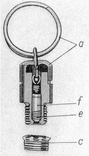 8. Der Zündschnuranzünder 29 (Bild 3 und 4) besteht aus dem Oberteil mit Abreißring (a), Reibdraht (e) und Reibzündhütchen (f) und aus dem Unterteil mit Gewinde (b) zum Einschrauben in das Zündladungsröhrchen. Eine Schutzkappe (e) dient als Abschluß ge-gen Feuchtigkeit bei der Lagerung. Zur Sicherung wird der Abreißring durch ein Siche-rungsblech (d) am Zünderschaft festgehalten. |