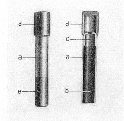 Der grüne Farbanstrich am unteren Ende (e) ist das Kennzeichen der Zündladung N 4 zu ihrer Unterscheidung von der Sprengkapsel Nr. 8 (Pionierzündmittel). |