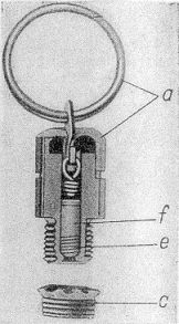 6. Der Zündschnuranzünder 29, Ausführung B (Bild 3 und 4), besteht aus dem Oberteil mit Abreißring (a), Reibdraht (e) und Reibzündhütchen (f) und aus dem Unterteil mit Ge-winde (b) zum Einschrauben in das Zündladungsröhrchen. Eine Schutzkappe (c) dient als Abschluß gegen Feuchtigkeit bei der Lagerung. Zur Sicherung wird der Abreißring durch ein Sicherungsblech (d) am Zünderschaft festgehalten. |