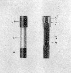 Der schwarze Anstrich am unteren Ende (e) ist das Unterscheidungskennzeichen der Zündladung N 2 von der Sprengkapsel Nr. 8 (Pionierzündmittel) und der Zündladung N 1 (für Nebelkerze) mit weißem Anstrich. |