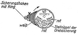 Läßt sich der rote Punkt der Drehsicherung in Richtung "Sicher" so weit drehen, daß er in der Mitte zwischen rotem Strich "Scharf" und weißem Strich "Sicher" steht, dann ist der T-Minenzünder auch bei angeschertem Scherstift gesichert. |