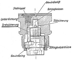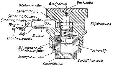 Das Innere des Zünders ist durch eine Lederdichtung abgedichtet, die mit einer Mutter auf dem Sicherungsbolzen befestigt ist. Der Stift im Stutzen verhindert völliges Heraus-ziehen des Sicherungsbolzens beim Entsichern. |