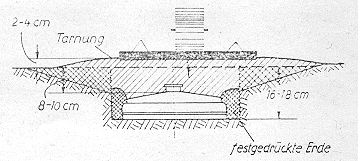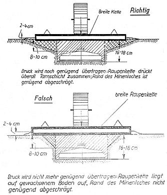 Hohlräume um die Mine sind zu vermeiden, da sonst die Tarnung dem Druck des Panzer-fahrzeuges ausweicht. |