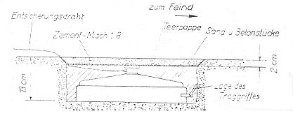 Die Dachpappe usw. verhindert das Abbinden dieser Tarnschicht mit dem Beton der Straßendecke und dem darunter liegenden Füllstoff. Um das Erkennen der Mine zu er-schweren, wird die Straße streifenweise mit Zementmilch übergossen. Bei Regen muß die frisch aufgebrachte Tarnung die Straßendecke um ¼ bis ½ cm überragen, da die Tarnung durch den Regen einsinkt. |