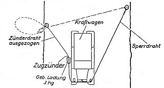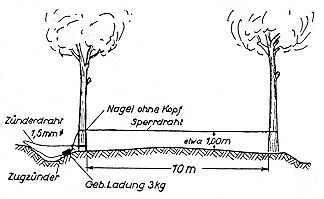 129. Über die Straße wird in 1,00 bis 1,10 m Höhe ein 1,5 mm starker Draht als Sperr-draht gezogen. Auf einer Seite wird er lose über einen auf der feindabwärtigen Seite in einem Baum eingeschlagenen Nagel (ohne Kopf) gelegt, weiter bis zum Boden zu einer geballten Ladung 3 kg (nicht T-Mine, die zu schwer ist) geführt und an dieser befestigt. Die Ladung wird mit einem Zugzünder versehen. Durch die Öse des Zugbolzens wird ein Zugdraht – Länge bis zur Straßenmitte reichend – gezogen, der entweder an einem Baum oder an einem in der Nähe des Baumes eingeschlagenen Pfahl befestigt wird. Bei geball-ten Ladungen 3 kg alter Fertigung ist der Zünder durch einen Drahtbund gegen Biegen oder Abbrechen zu schützen16). Nach Tarnung der Mine und Entfernen des Sicherungs-bolzens ist die Mine zündfertig. |