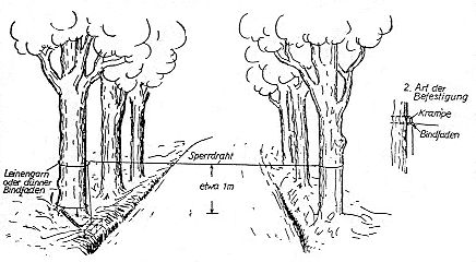 Der in 1,00 bis 1,10 m Höhe über die Straße gezogene 1,5 mm starke Sperrdraht wird entgegen 129 entweder an einer Krampe, die auf der nach der Straßenseite zu zeigenden Seite in den Baum geschlagen wird, mit Leinengarn oder dünnem Bindfaden angebunden oder um den Baum wird in Höhe des Sperrdrahtes eine Schlinge aus Leinengarn oder dün-nem Bindfaden gelegt, durch die der Sperrdraht geführt und somit in der gewünschten Höhe festgehalten wird. Die Mine liegt dann an der Seite des Baumes, die nach der Stras-senmitte zu zeigt (Bild 67). Die Tarnung ist dabei etwas schwieriger, weil die Mine nicht durch den Baum versteckt ist, die Mine wird aber durch jedes Fahrzeug betätigt, das ge-gen den Sperrdraht fährt, ganz gleich von welcher Straßenrichtung es kommt. |