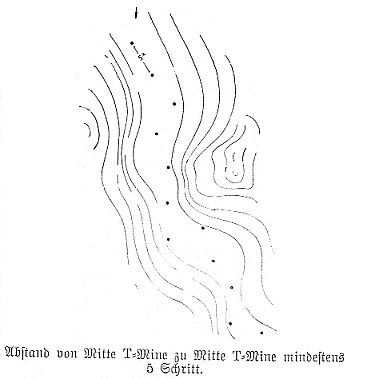 Jeder Mann verlegt seine zweite T-Mine fünf Schritt vorwärts, drei Schritt links (rechts) seitwärts seiner ersten T-Mine. |