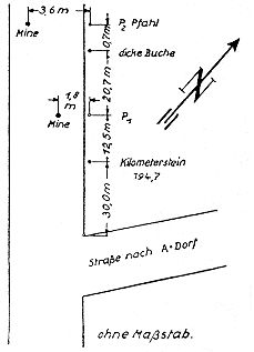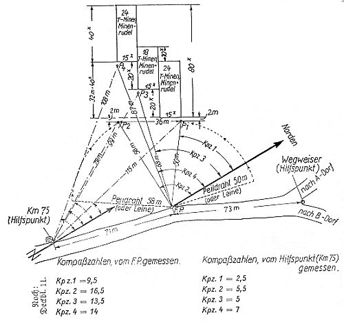 Ist im Ausnahmefall ein Minenfeld verlegt worden, das nicht sofort vermessen werden konnte, so muß ein geeigneter Punkt als Festpunkt nachträglich bestimmt werden, von dem aus die hintere Grenze des Minenfeldes baldigst nachträglich zu vermessen ist. |