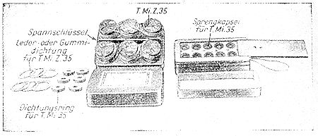 3. Zu 10 T-Minen gehören ferner eine "Einstellehre für T-Mine" im Kasten und ein "Steck-schlüssel für T-Mine" (im Sprenggerätekasten Satz a). |