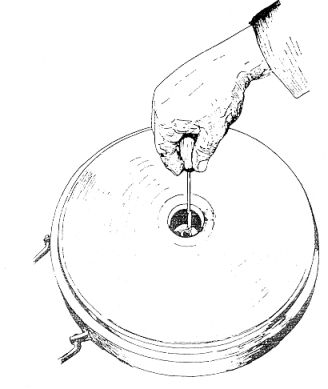 Das Zünderersatzstück (Bild 7) ist ein dem T-Minenzünder ähnliches Holzstück mit Metall-gewinde oder aus Isolierpreßstoff. Es ist vor dem Scharfmachen der T-Mine in den Druck-deckel geschraubt, um ein Verschmutzen des Gewindes im Druckdeckel zu verhindern und die Feder zu entlasten. |