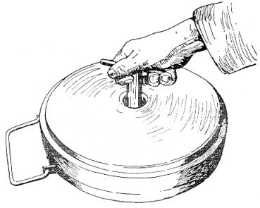 10. Vor Gebrauch der Einstellehre die Leder- oder Gummidichtung des T-Minenzün-ders, der nachher eingesetzt werden soll, auf das Gewinde der Einstellehre bis zum Konus aufstreifen. |