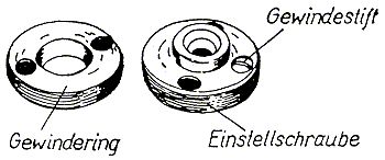 Vor Festziehen des in der Einstellschraube sitzenden Gewindestiftes darauf achten, daß er nicht in eine der Bohrungen des Gewinderinges kommt, sonst rutscht er durch (s. 16). |