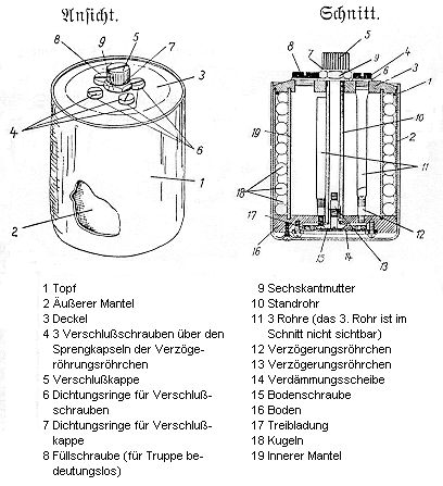 4. Die S-Mine 35 (Bild 1) hat eine Höhe von 13 cm (mit eingeschraubtem S-Minenzünder 25 cm), einen Durchmesser von 10 cm und ein Gewicht von 4 kg. |