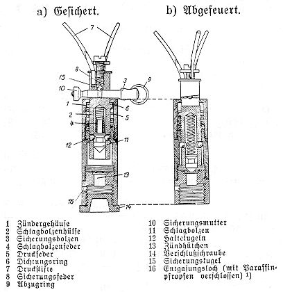 Werden nach Entfernen der Sicherungsmutter 10 und des Sicherungsbolzens 3 die Druck-stifte 7 des Zünders belastet, so bewegt sich die Schlagbolzenhülse nach unten und drückt die Druckfeder 5 zusammen. Beträgt der Druck 3 kg oder mehr, so wird die Schlag-bolzenhülse so weit nach unten geschoben, daß die Haltekugeln an der dafür vorgesehe-nen Kante der Verlängerung des Zündergehäuses seitlich ausweichen. Damit wird dem Schlagbolzen der Weg freigegeben. Unter dem Druck der Schlagbolzenfeder schlägt der Schlagbolzen auf das Zündhütchen 13 und zündet dieses. |