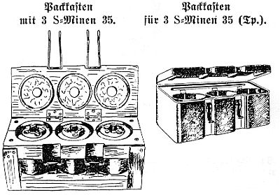 16. 9 S.Mi.Z.35 (in 2 oder 3 Kästchen) und 9 Zwischenstücke für Drahtminen (23), letz-tere lose, sind in einem hölzernen Zündmittelkasten (für 9 S-Minen 35) verpackt. Fer-ner befinden sich in diesem Zündmittelkasten 27 Sprengkapseln (in 2 Kästchen), 15 Z.Z.35 und 27 Ersatz-Dichtungsringe3)4). |