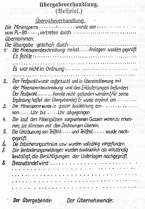 85. Jede Minensperre ist bei Ablösung durch eine Übergabeverhandlung nach dem in Bild 36 gegebenen Beispiel zu übergeben. |