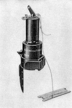 Eisenhülse, mit Schraubansatz zum Aufschrauben auf den Leuchtkörper. Die Hül-se enthält ein Führungsrohr für den Schlagbolzen. Dieser befindet sich unter Fe-derspannung und ist am oberen herausragenden Ende durch eine geschlossene Sicherheitsnadel gesichert. Der Schlagbolzen wird in dem Führungsrohr dadurch unter Spannung gehalten, daß das Winkelstück in eine Eindrehung an dem aus der Hülse herausragenden Schlagbolzenende eingreift. Das Ausrasten wird durch ein dreieckiges Klemmstück verhindert, das zwischen Schlagbolzenende und dem senkrecht nach oben stehenden Schenkel des Winkelstückes eingeklemmt ist. Das Klemmstück hat an seinem oberen Ende ein Loch für die Befestigung des Zugdrahtes. Der Zugdraht wird jeder Verpackung in 80 m Länge beigefügt. Die Sicherheitsnadel ist durch das Winkelstück, Klemmstück und Schlagbolzenende hindurchgeführt und verhindert eine unbeabsichtigte Auslösung des Schlagbol-zens. Eine auf die Sicherheitsnadel aufgeschobene Pappscheibe verhindert ein selbständiges Herausrutschen derselben in geöffnetem Zustand. An der Sicher-heitsnadel ist eine auf ein Pappstück ausgewickelte Entsicherungsschnur befes-tigt. Sie ist durch gelbe Einfärbung gekennzeichnet. |
