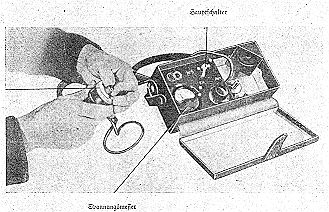(3) Das Meßinstrument nebst Spannungsregler und Ausschalter ist auf einer Iso-lierstoffplatte montiert. Die Trockenbatterie, eine 1,5 Volt Stabelementzelle, ist von außen auswechselbar angeordnet. Zu diesem Zweck befindet sich auf der einen Kastenschmalseite eine mit Griff versehene runde Platte, die durch leichte Linksdrehung entfernt werden kann. In der dadurch frei werdenden Höhlung sitzt das Stabelement, welches herausgenommen und durch ein neues ersetzt werden kann. Der Prüfstecker ist an das Meßgerät fest angeschlossen und liegt im Kasten in einer geeignet gestalteten Haltevorrichtung. |