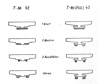 1. T-Minen 42 und T-Minen (Pilz) 43 können durch Abschrauben der Druckkappen bzw. Druckdeckel (genannt Pilz) und Herausnehmen der T-Minenzünder 42 wirkungslos ge-macht werden. |
