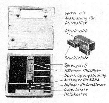 Die Holzmine 42 (Bild 1) wird in Marsch- und Gefechtssperren gegen Fahrzeuge aller Art, insbesondere gegen Panzerkampfwagen, eingesetzt. Sie zerknallt bei einer Be-lastung von 200 bis 300 kg und kann als Ersatz für die T-Mine verwendet werden. |