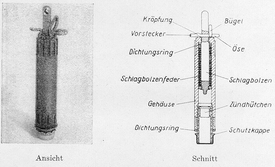 Der Z.Z. 42 (Bild 5) wird nach Abschrauben der Schutzkappe durch Einsetzen der Sprengkapsel (Loch auf Loch !) zündfertig gemacht. Er ist vor dem Einsetzen der Sprengkapsel auf festen Sitz des Vorsteckers zu prüfen, dessen Bügel am Schlagbolzen anliegen muß. |