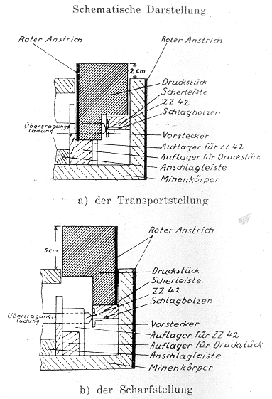 Der Zünder mit Sprengkapsel wird in die Übertragungsladung vorsichtig fest einge-schraubt und mit ihr von oben her in den Kasten eingelegt. Die Öse des Vorsteckers zeigt hierbei nach unten, der Bügel muß waagerecht liegen. Der Zünder muß ohne Widerstand zwischen der Scherleiste und dem Auflager für den Z.Z. 42 hindurch-gleiten. |