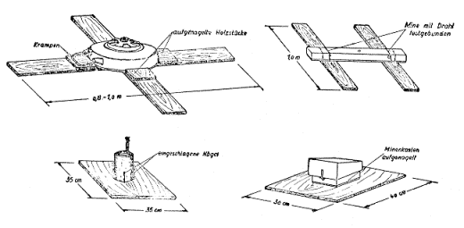 Im Schnee oder Schlamm verlegte Minen müssen auf Holzkreuzen oder Brettstücken be-festigt werden, um zu vermeiden, daß dagegenfahrende Fahrzeuge sie zur Seite schieben und wirkungslos in den weichen Untergrund drücken (Bild 1). Die Minen müssen auf den Unterlagen durch Nägel oder Bindedraht befestigt werden. |