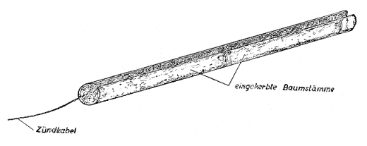 Auf dem Eise hat sich das Verlegen der Zündkabel in rinnenförmig eingekerbten Baum-stämmen bewährt. Bei Tauwetter oder anderweitiger Wasserbildung wird das Kabel mit ihnen gehoben (Bild 2). |