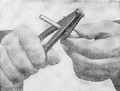 Sprengkapsel Nr. 8 auf den Nippel des Zünders bis zum Anschlag aufschieben und mit der beigegebenen oder einer gewöhnlichen Würgezange festwürgen (Bild 7 und 8). |