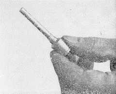Verschlußkappe abschrauben, Holzstopfen entfernen und Vertiefung im Spreng-stoff (wie bei der Eismine beschrieben) für die Sprengkapsel des Glühzünders herstellen. |
