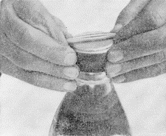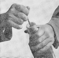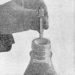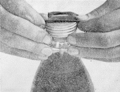 Den Zünder mit der Sprengkapsel Nr. 8 in die Bohrung des Holzstopfens im Fla-schenhals, ohne Druck auszuüben, so einsetzen, daß das Zündergehäuse im Holzstopfen aufsitzt (Bild 10). |