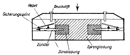 Zum Beseitigen der Mine wird sie vorsichtig freigelegt und, ohne Druck auf den Deckel auszuüben, herausgenommen, die Seitenbretter werden entfernt und der vereinfachte Zünder, nach Abheben des Sicherungsstiftes vom Hebel, mit der Sprengkapsel herausge-nommen. |