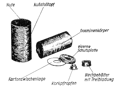 Der Gas-Minenkörper (Bild 176) ist ein Eisenblech-Zylinder mit angeschweißtem Kopf- und Bodenstück. |