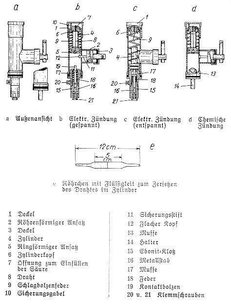 Bei der chemischen Zündung (Bild 164d) wird in den Halter (14) eine Sprengkapsel oder die Zündschnur eingesetzt. Dann wird in die Muffe (13) über der Sprengkapsel die Zünd-mischung (unbekannt) und ein Röhrchen mit Schwefelsäure gelegt und beides mit dem Gummiüberzug überdeckt, dann wird die Muffe in den Zünder eingeschraubt. |
