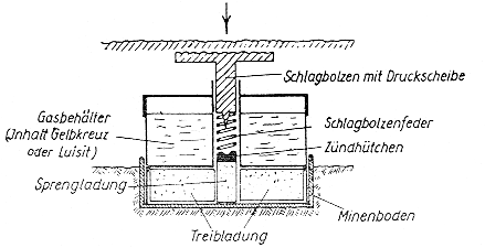 Wird die Mine belastet, bringt der an der Druckscheibe befestigte Schlagbolzen das Zünd-hütchen und durch dieses die Spreng- und die Treibladung zum Zerknall. Der Gasbehälter wird hochgeschleudert und zerplatzt. |