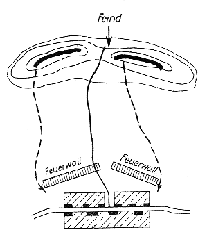 Feuerwälle (Bild 181) sollen den Vormarsch des Gegner verzögern. Sie werden hauptsäch-lich in der Nähe von Ortschaften und Ansiedlungen angelegt, um das Feuer auf diese zu übertragen. |