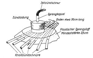 Die Verwendung von plastischem Sprengstoff als Verbindung ermöglicht Einmündung der Knallzündschnüre in jeder Richtung. Es können bis zu zwölf Knallzündschnüre an-geschlossen werden. Die Knallzündschnüre müssen von der Verbindungdung bis zur Sprengladung möglichst gradlinig verlaufen. Sie werden mit der Zündladung zwi-schen zwei Sprengkörpern aus plastischem Sprengstoff eingepreßt. |