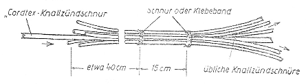Da die handelsübliche "Cordtex"-Knallzündschnur empfindlicher ist als die verwendeten Knallzündschnüre, können ihre Verbindungen einfacher hergestellt werden. |