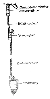 Gezündet wird mit dem mechanischen Zeitzündschnuranzünder (Bild 7) über eine Verbin-dung von Zeitzündschnur–Sprengkapsel–Knallzündschnur, die beiderseits einer Zündla-dung (Abschn. I. B, 1) verknotet ist (Bild 37). |